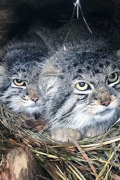 Pallas’ cats typically have two to five kittens per litter. This would be Nancy’s and Bo’s first adventure with parenting. Other than breeding, Pallas’ cats are typically solitary in the wild, and fathers don’t usually play a role in raising kittens.