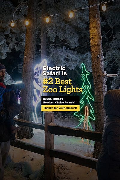 ZOO LIGHTS CONTINUE NIGHTLY THROUGH JAN. 1, 2026 (*EXCEPT CHRISTMAS EVE)! – Electric Safari just matched its highest ranking ever in a national contest for Best Zoo Lights. Dedicated Cheyenne Mountain Zoo supporters voted daily for nearly a month to earn the annual holiday event second place among accredited zoos throughout North America.